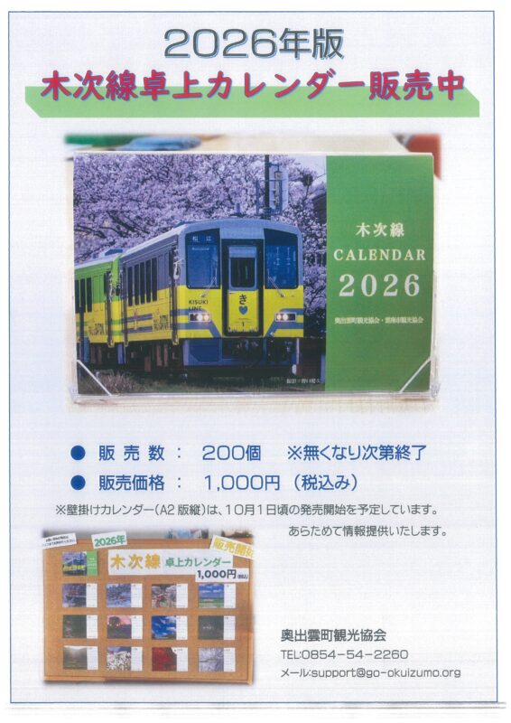 昨年も製作いたしました「木次線カレンダー(卓上版)」を今年も製作し、9月19日(金)より販売を開始します。