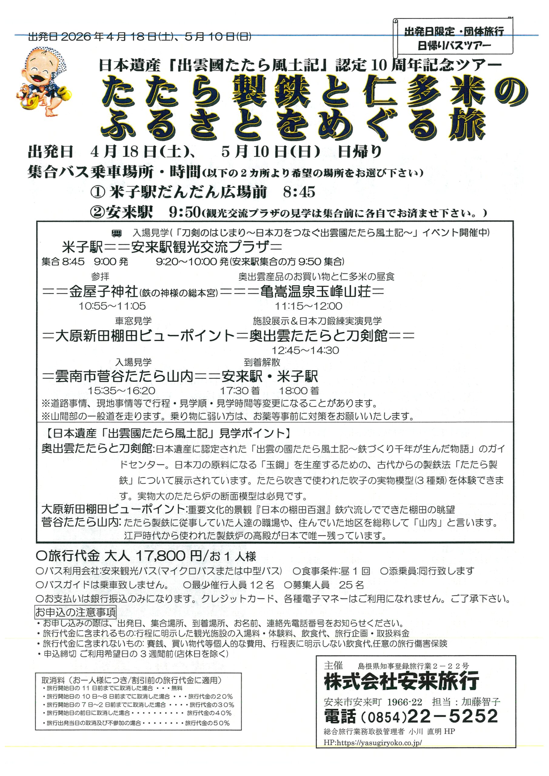 こちらをご覧ください。→ 【(株)安来旅行】日本遺産「出雲國たたら風土記」認定10周年記念バスツアー実施について